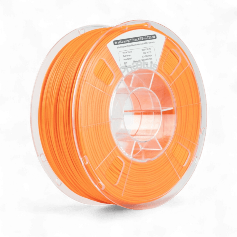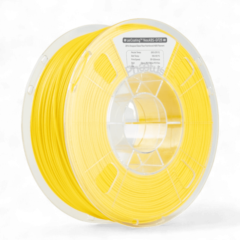 aeCoating™ NexABS-GF25 is a new generation of industrial 3D printing filament. It features a skin-core structure achieved by using multi-layer co-extrusion technology. The outer ‘skin’ of the filament is a modified resin with high layer adhesion. The inner core is reinforced resin containing high chopped fibre content. The co-extrusion skin-core technology has greatly increased fibre content while maintaining the toughness of the filament. Thus improved the mechanical properties as well as heat resistance of printed parts. - Excellent layer adhesion: