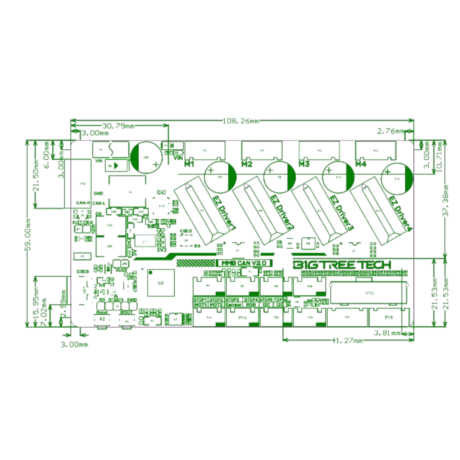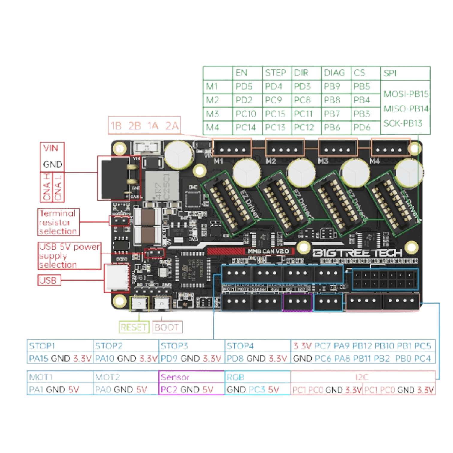- STP1-STP11, I2C (V2.0: 2x I2C), RGB, Sensor (infrared sensor interface), USB, CAN