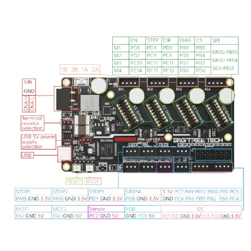 firmware in DFU mode via USB. - I2C interface (2x on the V2.0 board) reserved for filament run out/clogging detection, or other DIY